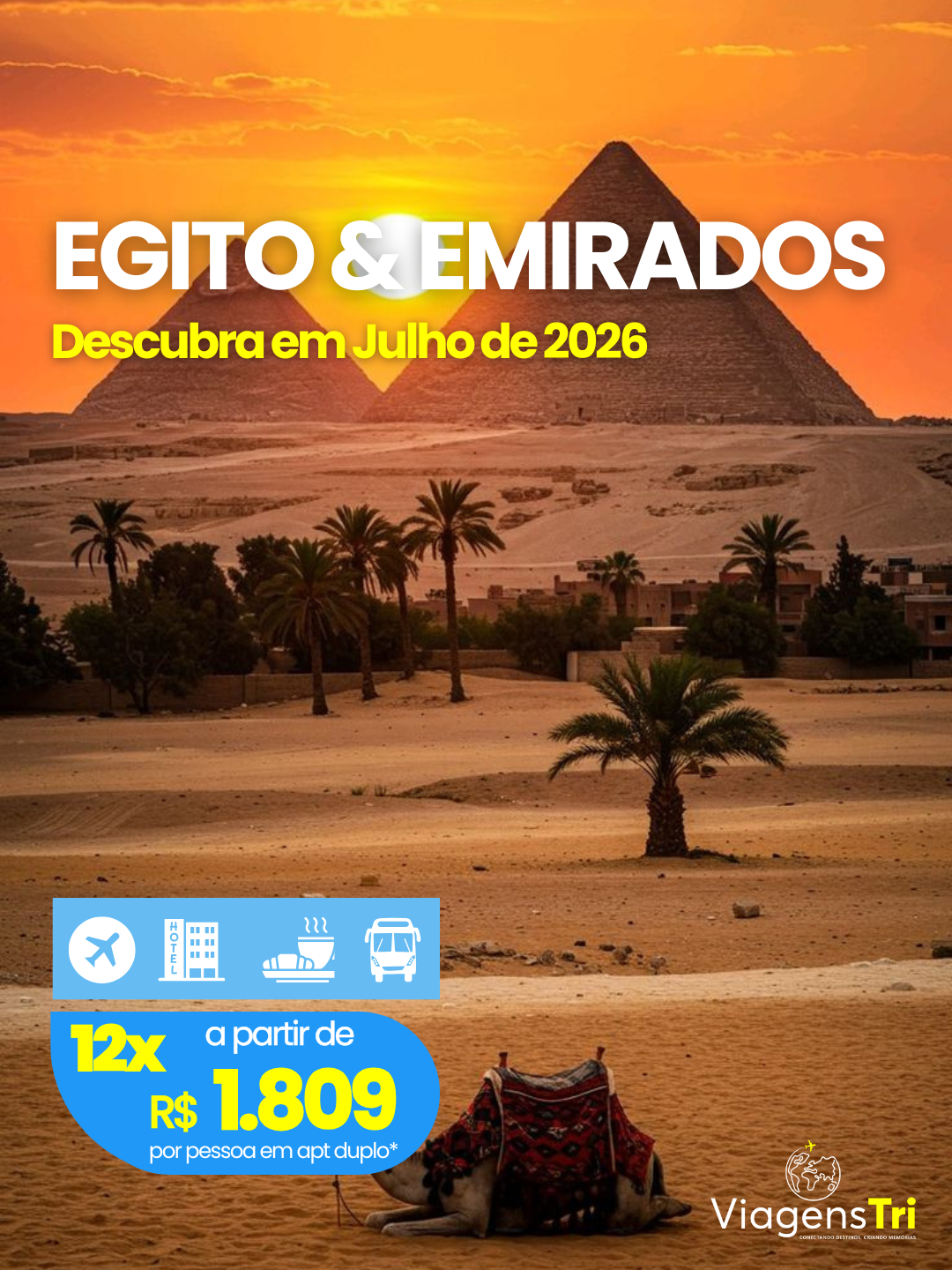 Outras datas e aeroportos sob consulta.Explore o fascinante contraste entre a história milenar do Egito e a modernidade impressionante dos Emirados Árabes Unidos, em um roteiro completo que une cultura, arqueologia, luxo e experiências inesquecíveis, com a curadoria da Viagens Tri.